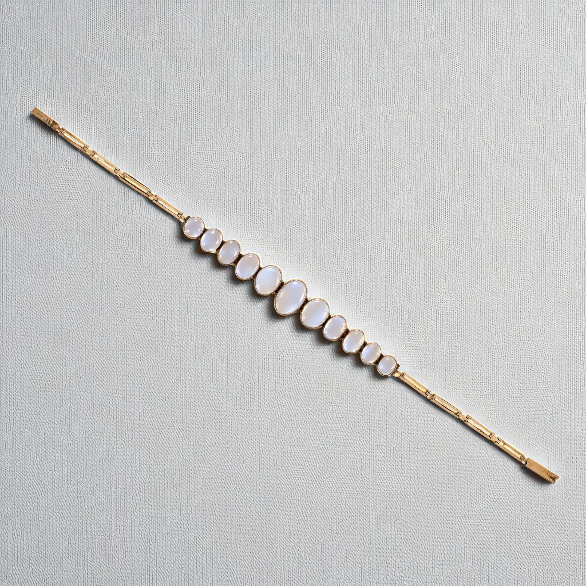 This beautiful antique bracelet, crafted in yellow gold, features a graceful series of eleven graduated cabochon moonstones, each glowing with a subtle, ethereal shimmer. Expertly set to highlight the stones’ natural luminescence, the piece embodies elegance and sophistication, making it a striking addition to any jewellery collection.