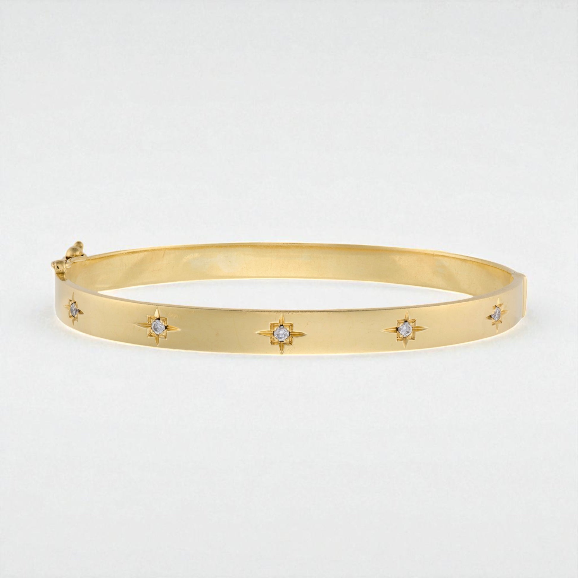 Add a touch of timeless elegance to your collection with this stunning diamond bangle, expertly crafted in radiant 14k yellow gold. The front of the hinged design sparkles with five brilliant round-cut diamonds, each nestled within delicate star motifs that catch the light with every movement. Stamped with both 14k and 585 indicating 14ct gold, this piece is the perfect blend of classic charm and refined luxury—an ideal gift or personal indulgence that will never go out of style.