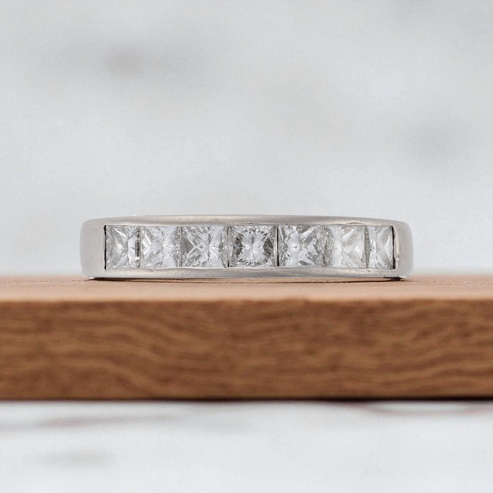 Timeless elegance meets refined craftsmanship in this stunning diamond band, crafted in luxurious 18K white gold. Featuring seven exquisitely channel-set princess cut diamonds with a total carat weight of approximately 1.25ct, this piece exudes sophistication and brilliance from every angle. Hallmarked for 18ct gold, it's the perfect symbol of enduring beauty—whether worn alone or stacked for added impact.